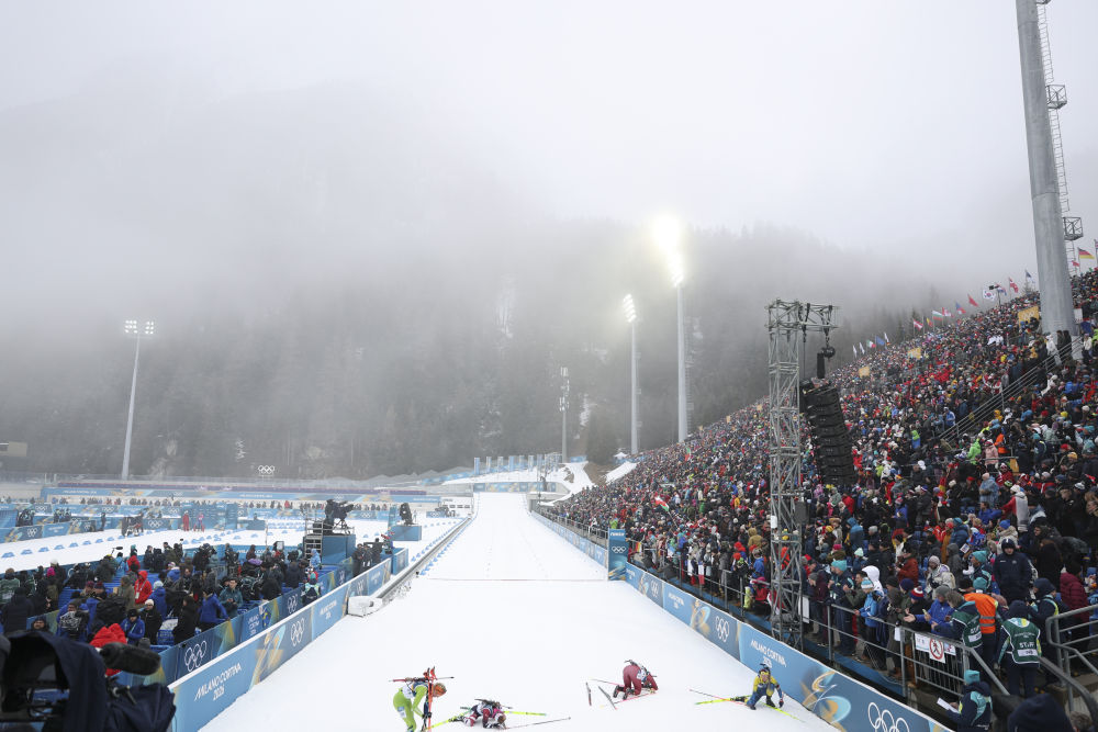 2月15日,观众在场边观看冬季两项男子12.5公里追逐赛。新华社记者 江汉 摄