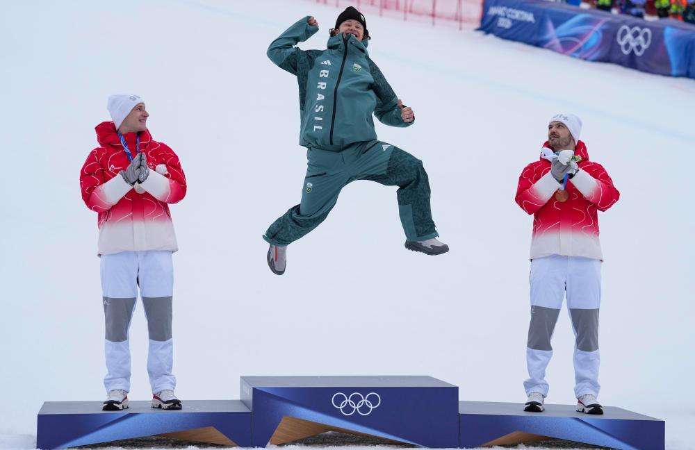 2月14日,冠军巴西选手卢卡斯·布罗滕(中)、亚军瑞士选手马尔科·奥德尔马特(左)、季军瑞士选手路易克·梅拉尔在高山滑雪男子大回转颁奖仪式上。新华社记者 胡虎虎 摄