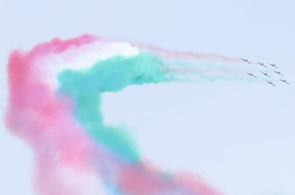 2月12日,意大利“三色箭”飞行表演队在高山滑雪女子超级大回转比赛后进行飞行表演。新华社记者 张晨霖 摄