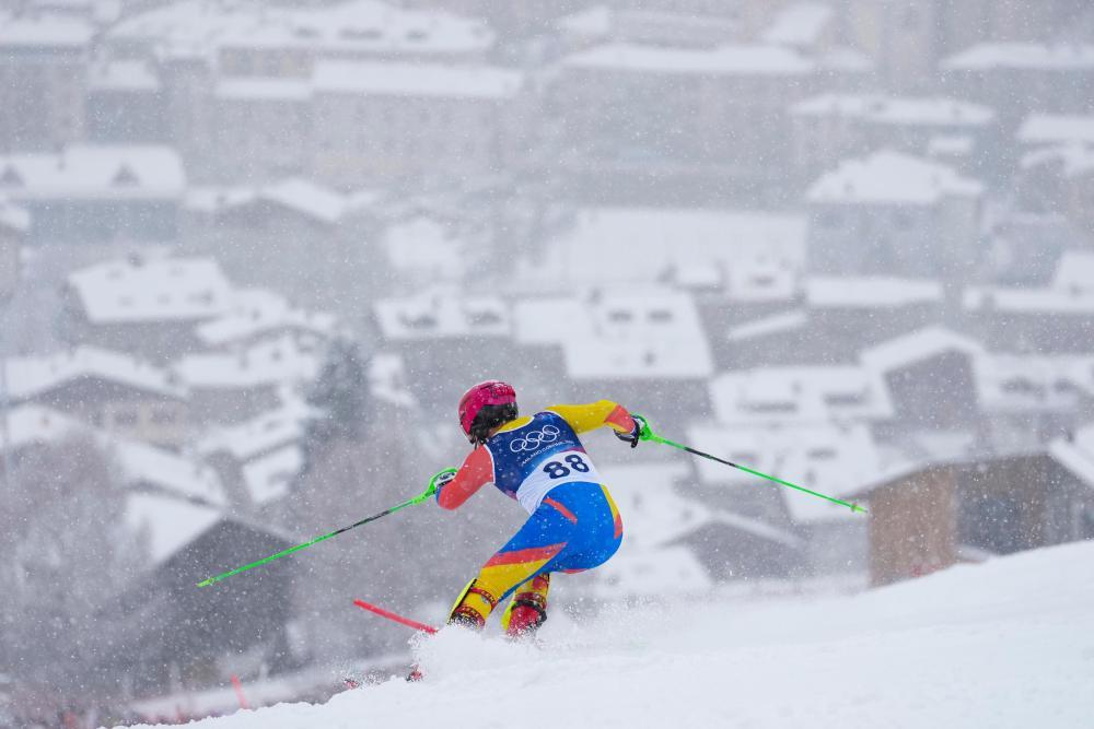 2月16日,蒙古国选手阿勒坦珠勒在高山滑雪男子回转比赛中。新华社记者 胡虎虎 摄