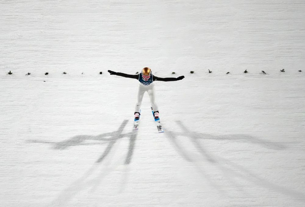 2月14日,斯洛文尼亚选手多门·普雷夫茨在跳台滑雪男子个人大跳台比赛中。新华社记者 黄伟 摄