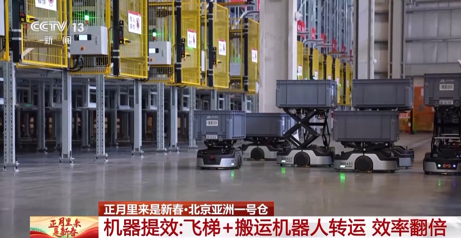 货架上货物整齐排列,飞梯机器人在货架间穿梭取货,地面有搬运机器人接力转运,给年货调配加速。
