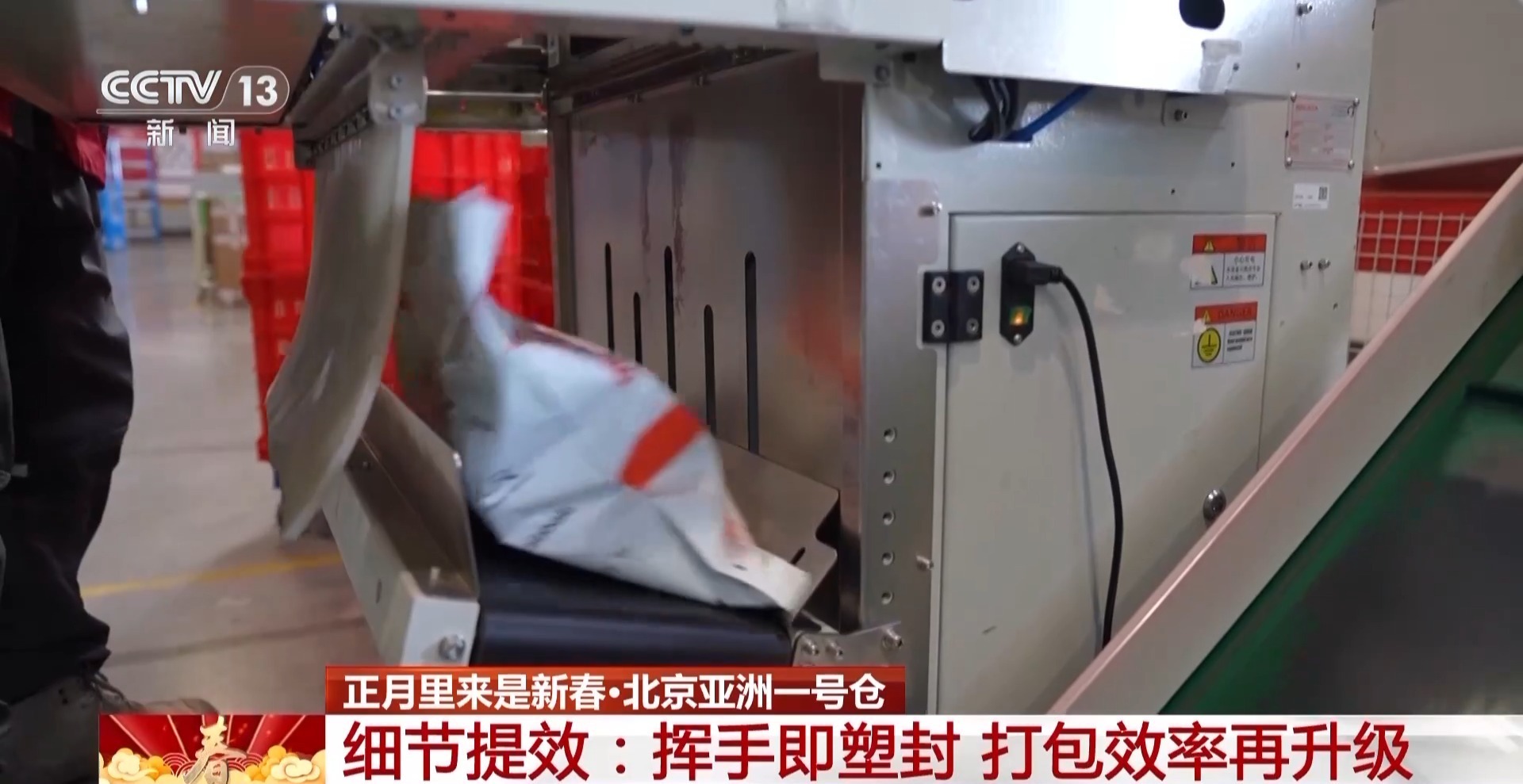 物流效率的提升,也体现在“打包”等很多细节里,以前打包年货服装,都是工作人员手动操作。现在,工作人员只需要轻轻挥手,系统就能感应需求,自动完成封胶条流程,出货速度和效率有了很大提升。