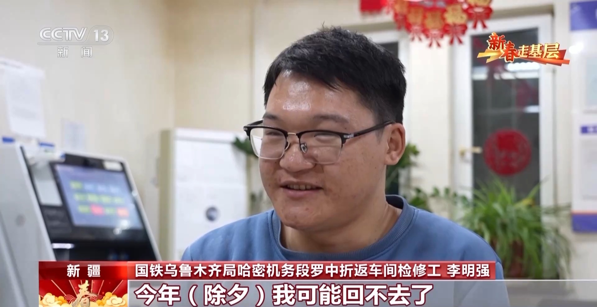 国铁乌鲁木齐局哈密机务段罗中折返车间检修工 李明强:爸、妈,儿子在这给您拜年了。今年除夕我可能回不去了,但是你放心。大漠戈壁也是另一种风景,罗布泊有平时看不见的星空,落日也非常漂亮。在这里走好自己的每一步,就是对我们西部更好的一个发展。我觉得我的青春能在这里绽放出更加绚丽的色彩。