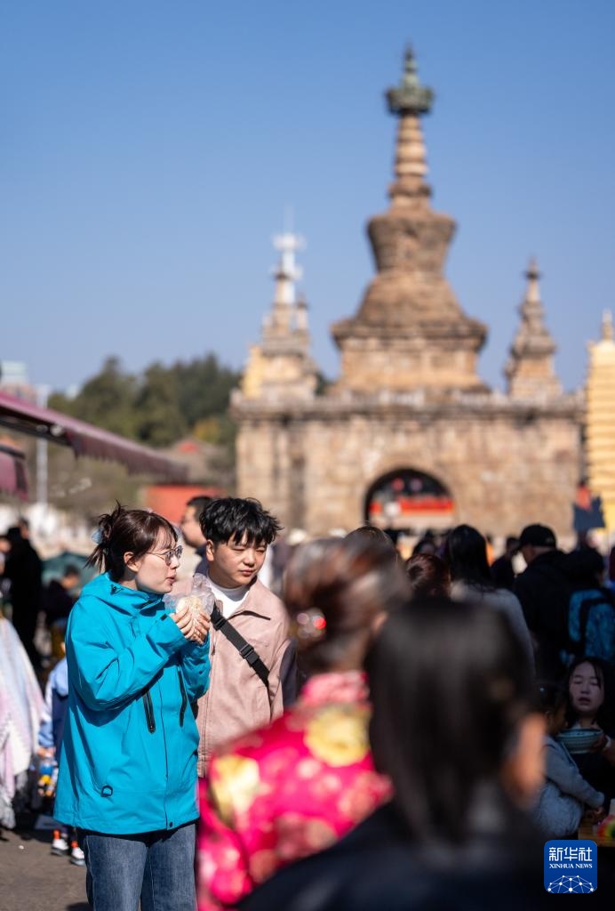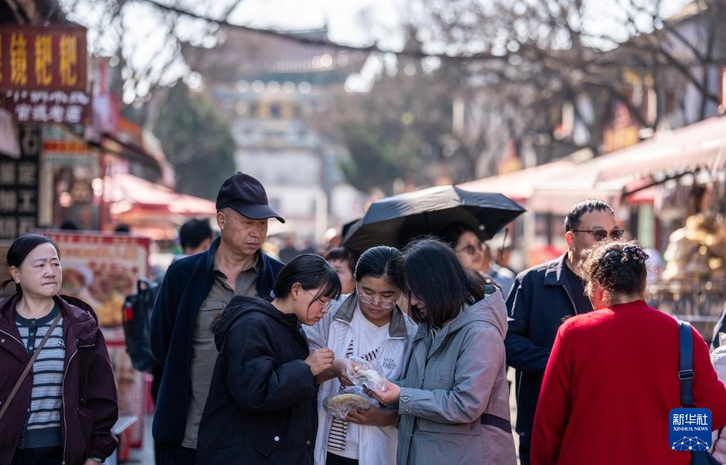 2月18日,游客在昆明市官渡古镇品尝官渡粑粑。新华社记者 江文耀 摄
