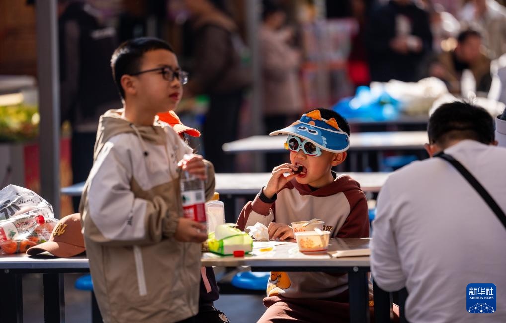 2月18日,小朋友们在昆明市官渡古镇品尝美食。新华社记者 江文耀 摄