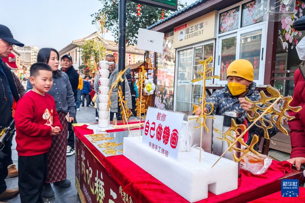 2月17日,游客(左)在湖南常德河街购买糖画。新华社记者 陈思汗 摄