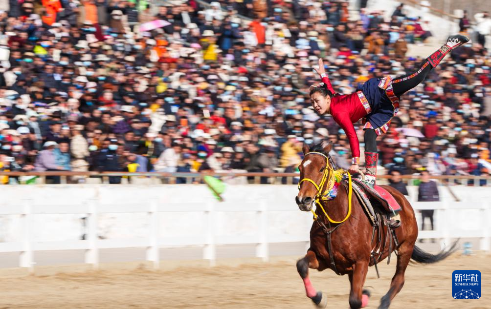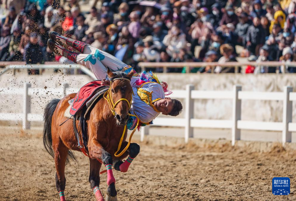 2月20日,马术队员在表演马上拾哈达。新华社记者 丁增尼达 摄