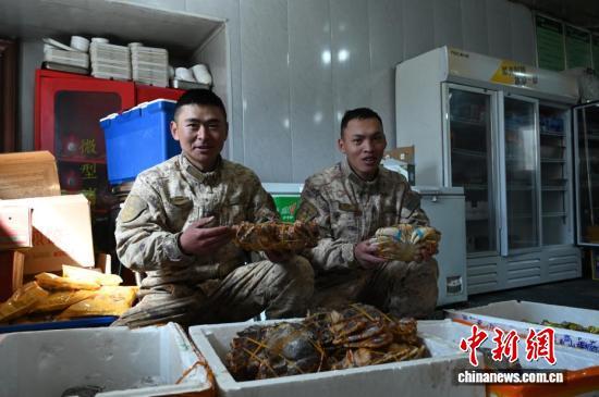 在努木日边防连,战士们收到了海鲜年货。赵朗 摄