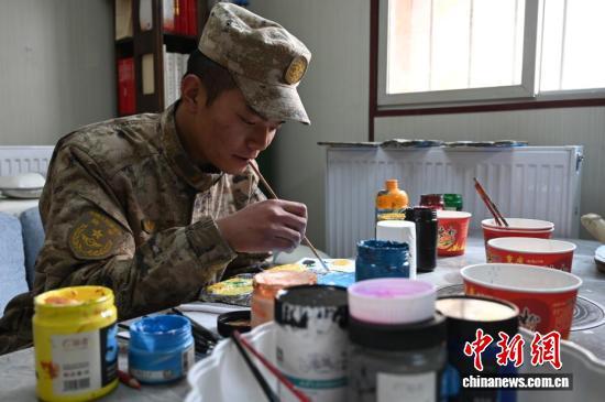 在5592哨所,战士在画石头画。赵朗 摄