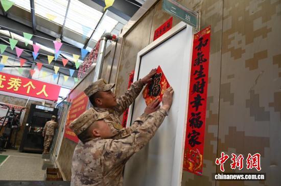 在5592哨所所属的连队,战士西热尼玛(右一)和战友在贴春联。赵朗 摄