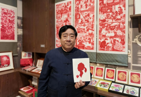 工坊中央,克树利被层层观众围住,叫好声此起彼伏。只见他手持一张巴掌大的红纸,目光在人群中一扫,随手拉住前排一位扎马尾辫的小姑娘,手上的剪刀便如游龙般翻飞起来。不画底稿、不做标记,红纸在他手中旋转变形,几十秒的工夫,一把剪刀开合之间,一张惟妙惟肖的人影剪纸便已成型——俏皮的马尾辫、抿着嘴的笑脸,甚至连小姑娘头顶上的发卡都清晰可见。“像!太像了!”围观人群中爆发出一阵热烈的掌声,小姑娘捧着剪纸,喜笑颜开。