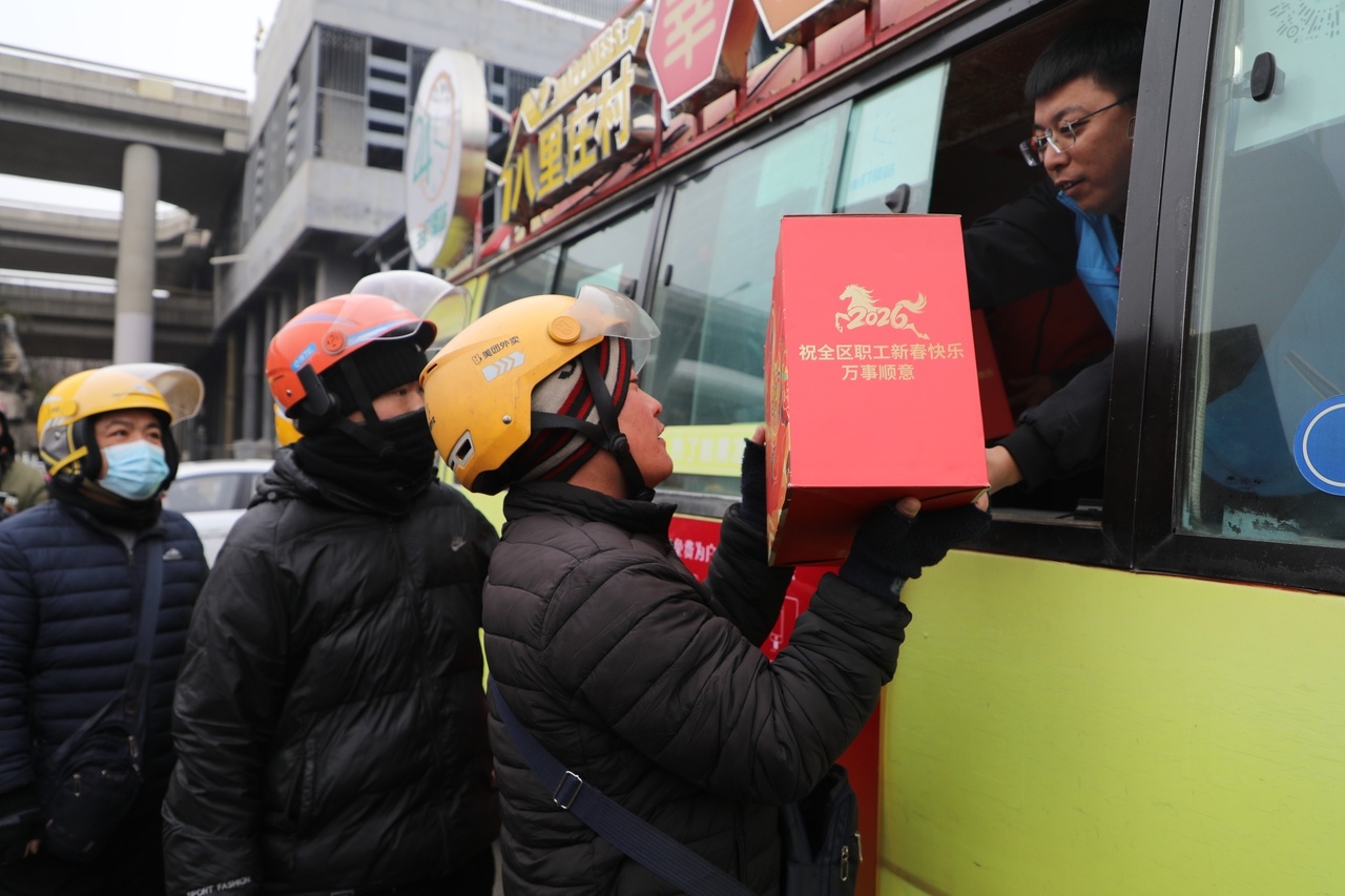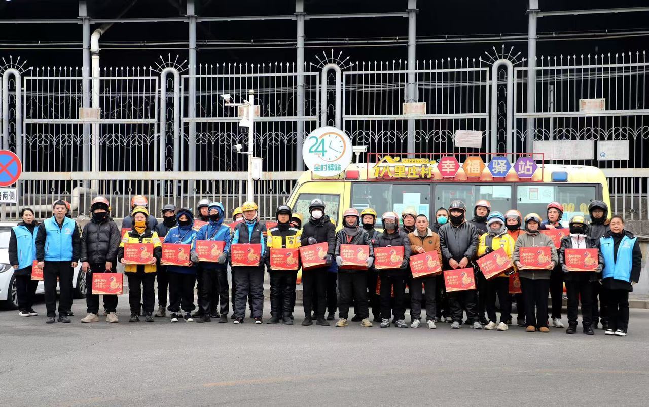 近日,北京市朝阳区高碑店地区总工会组织开展新就业群体集中慰问活动,为外卖骑手、快递员、网约车司机等一线从业人员送上暖心物资与新春祝福。