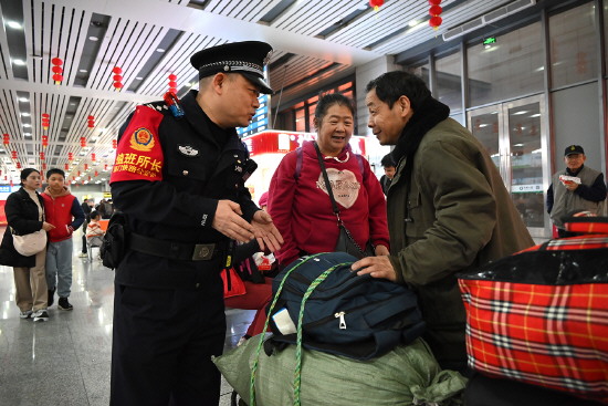图为林芳德在站厅内向旅客讲解出行安全注意事项。