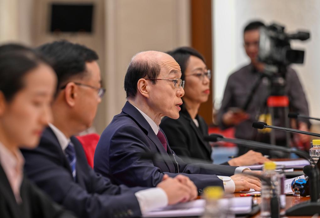 3月3日,全国政协十四届四次会议新闻发布会在北京人民大会堂举行。大会新闻发言人刘结一向中外媒体介绍本次大会有关情况并回答记者提问。这是记者在发布会上采访。新华社记者 陈晔华 摄