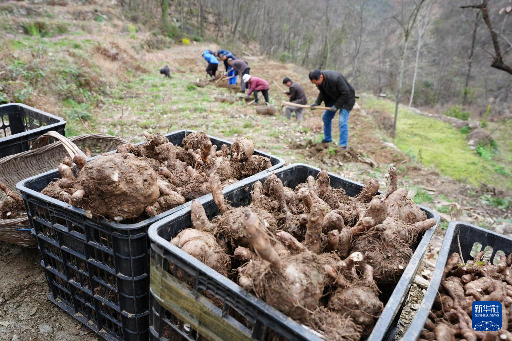 3月3日,陕西省旬阳市段家河镇弥陀寺村村民在村上的产业园中收魔芋。新华社记者 邵瑞 摄