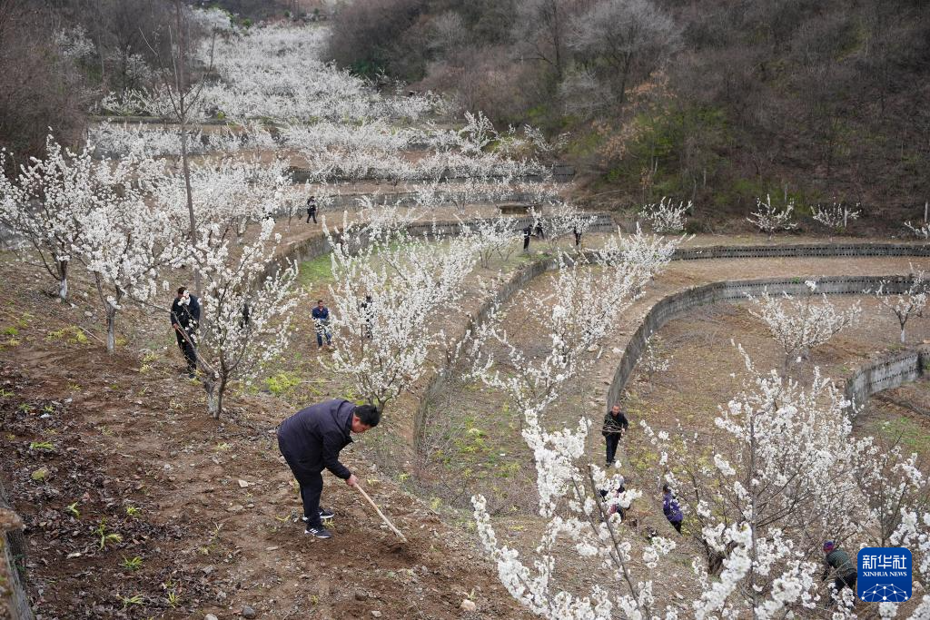 3月3日,在旬阳市段家河镇薛家湾社区樱桃园内,镇村干部和村民一起开展园区春管工作。新华社记者 邵瑞 摄