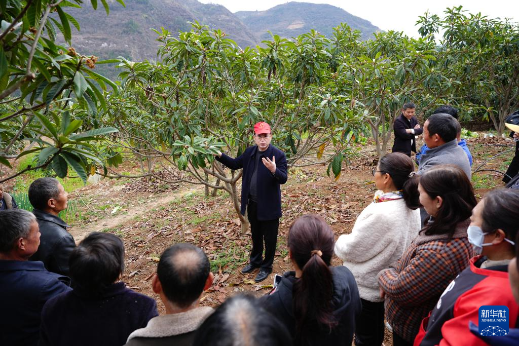 3月2日,在陕西省旬阳市城关镇两岔河村的枇杷林中,旬阳市林业技术推广站站长向甲斌向村民讲解果树管理的细节。新华社记者 邵瑞 摄