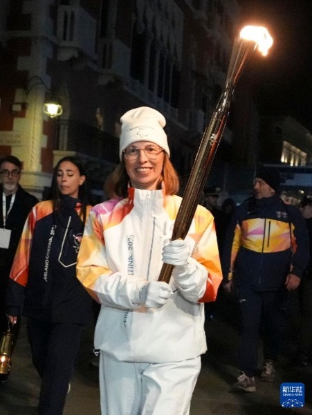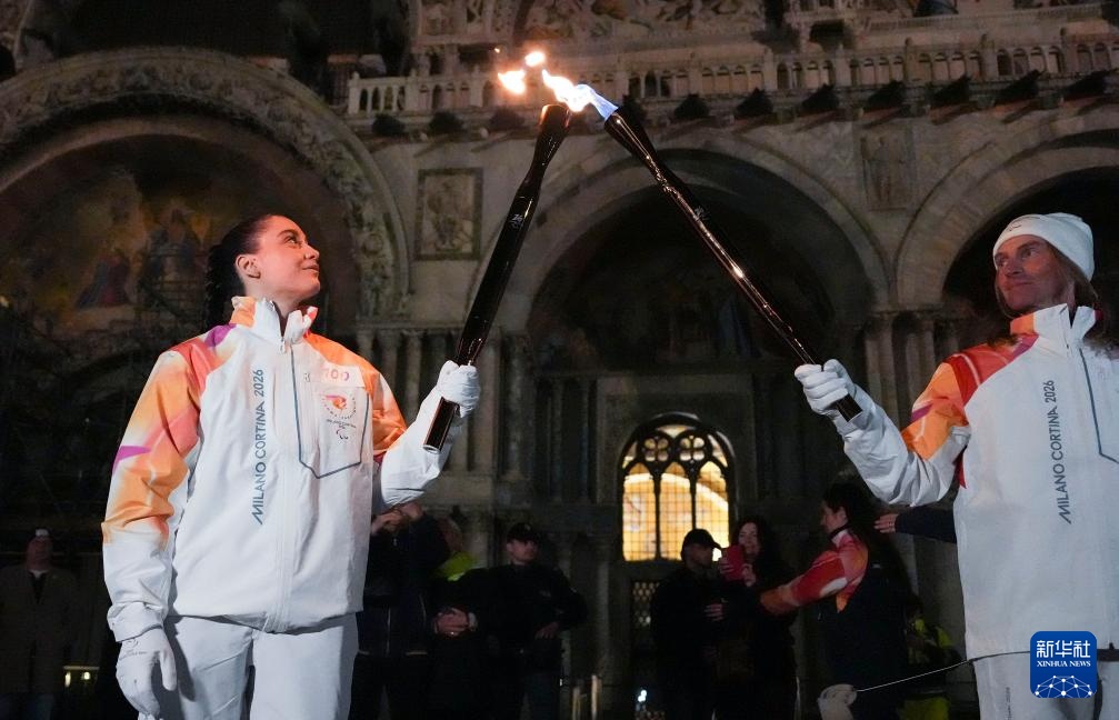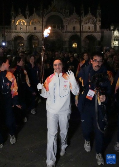 3月4日,火炬手维拉在威尼斯圣马可广场点燃火种台。新华社记者 侯俊 摄