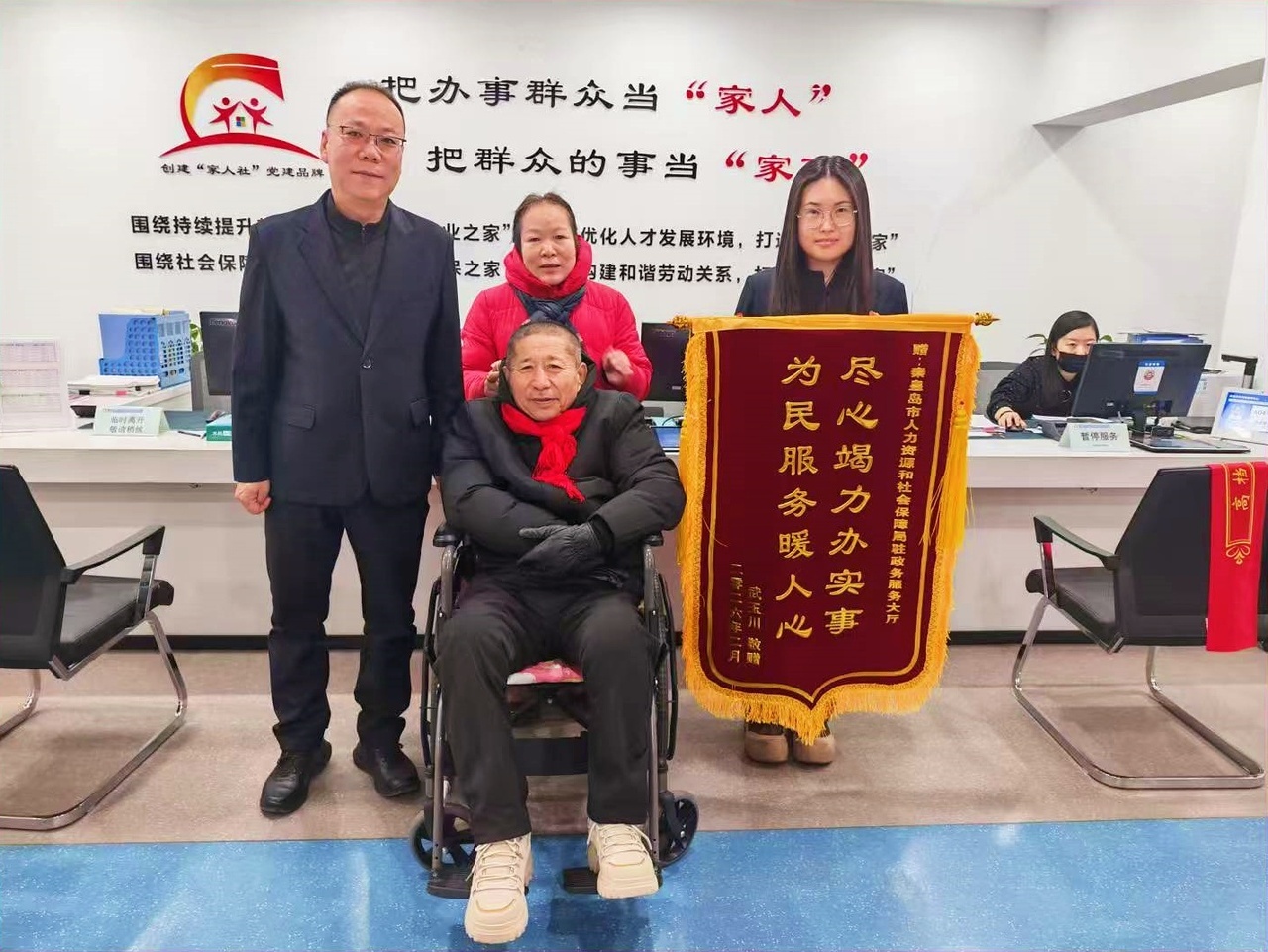“真是太谢谢你们了!要不是你帮忙,我们家这事儿真不知道要折腾到什么时候……”电话那头,老人声音哽咽,满是感激。两天后,她拖着不便的腿脚推着老伴,专程将一面鲜红的锦旗送到秦皇岛市政务服务大厅人社窗口,感谢工作人员的暖心帮扶。