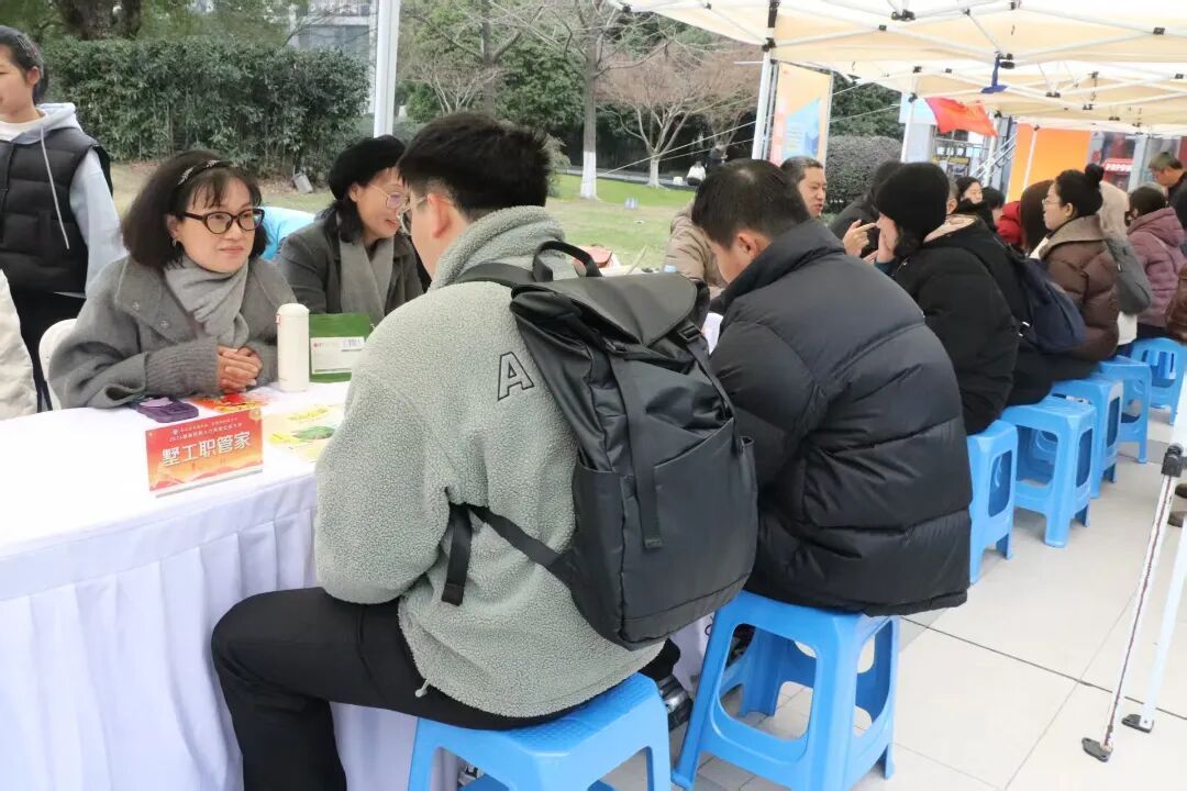 就在招聘会入口处的政策咨询区,工会服务的摊位前人头攒动,拱墅区总工会的“墅工职管家”正把政策宣传册等发放给前来咨询的人员,而工会职场心理咨询的桌前也交流不断。