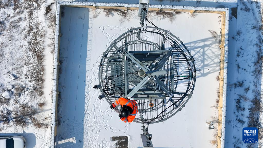 3月4日,铁路通信工佟海涛在位于黑龙江省肇东市的哈齐高铁9号基站铁路通信铁塔上进行维护作业(无人机照片)。新华社记者 王松 摄
