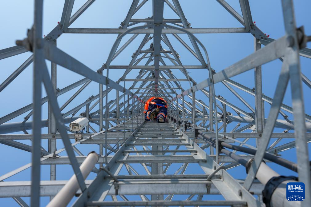 3月4日,在位于黑龙江省肇东市的哈齐高铁9号基站铁路通信铁塔上,铁路通信工佟泽龙向上攀爬。新华社记者 王松 摄