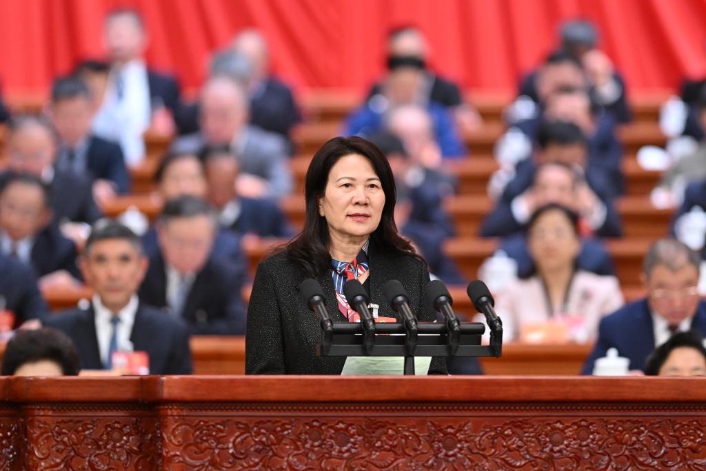 3月7日,全国政协十四届四次会议在北京人民大会堂举行第二次全体会议。这是江利平委员代表台盟中央作题为《实施“十五五”规划 高质量推进两岸融合发展示范区建设》的发言。新华社记者 李涛 摄