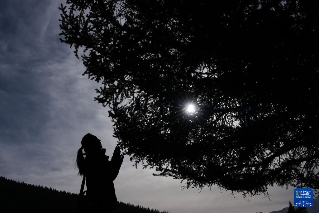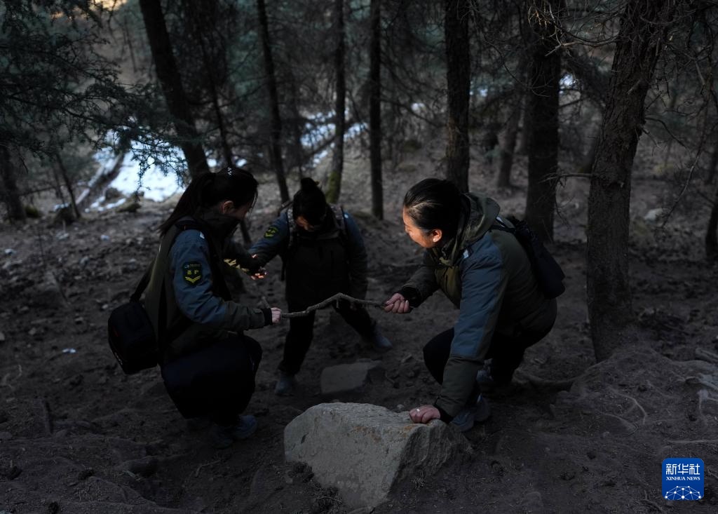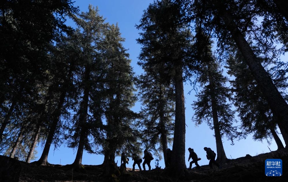 3月6日,祁连山国家公园(候选区)青海片区青阳沟管护站女子管护员张丽萍在查看林木生长情况。新华社记者 张龙 摄