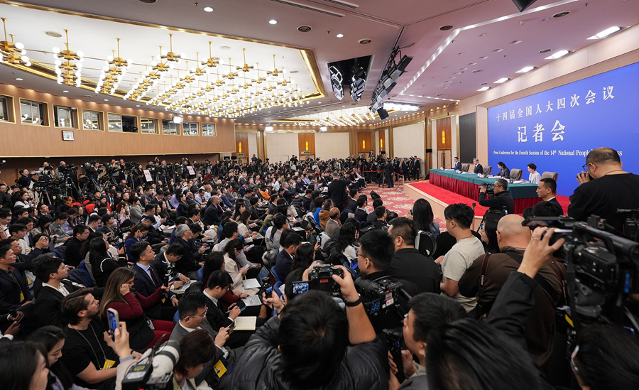 3月8日,十四届全国人大四次会议在北京梅地亚中心新闻发布厅举行记者会。中共中央政治局委员、外交部长王毅就“中国外交政策和对外关系”相关问题回答中外记者提问。这是记者在现场采访。新华社记者 李鑫 摄