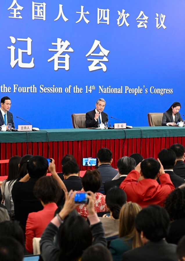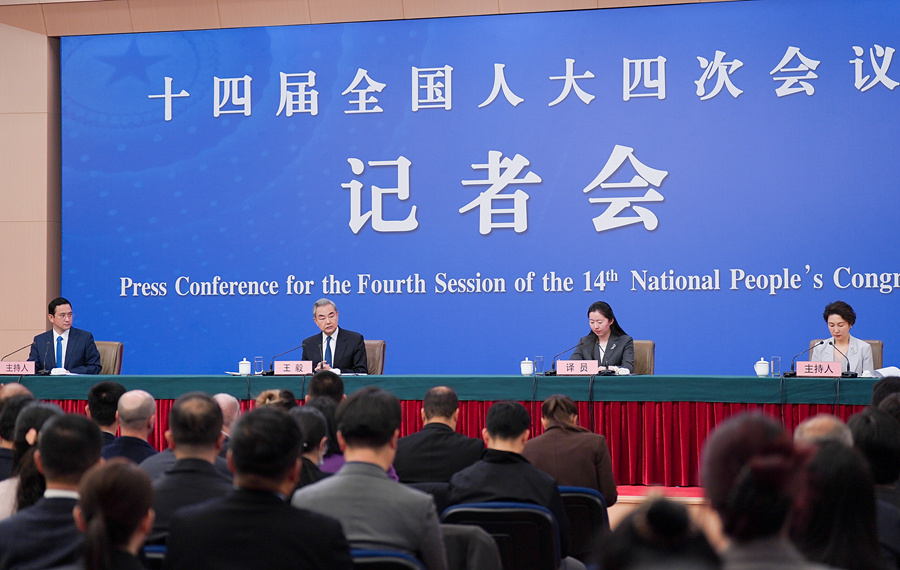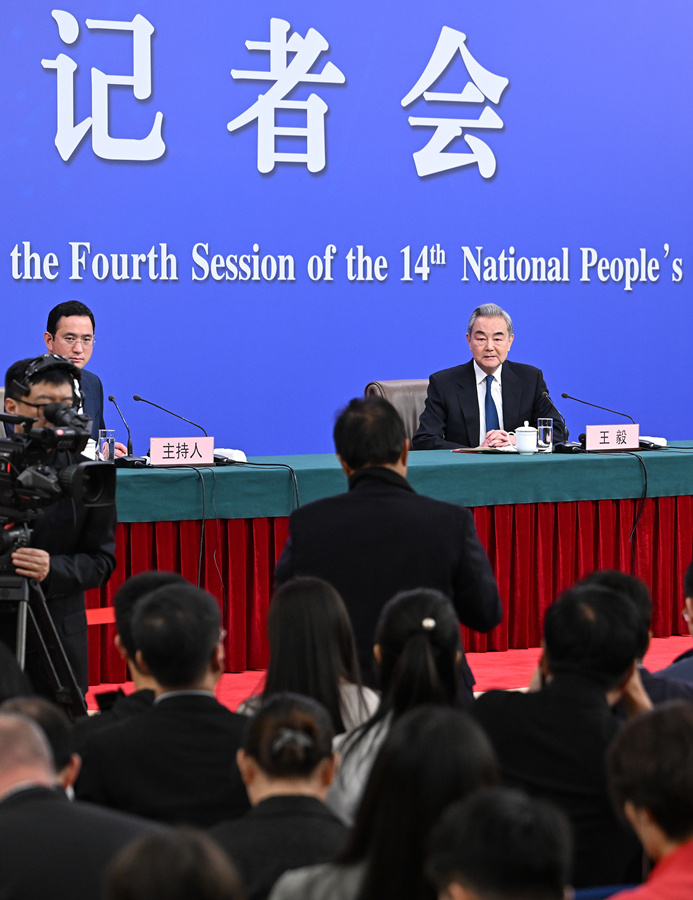 3月8日,十四届全国人大四次会议在北京梅地亚中心新闻发布厅举行记者会。中共中央政治局委员、外交部长王毅就“中国外交政策和对外关系”相关问题回答中外记者提问。新华社记者 李鑫 摄