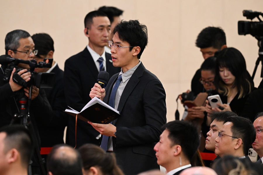 3月8日,十四届全国人大四次会议在北京梅地亚中心新闻发布厅举行记者会。中共中央政治局委员、外交部长王毅就“中国外交政策和对外关系”相关问题回答中外记者提问。这是记者在提问。新华社记者 王曦 摄