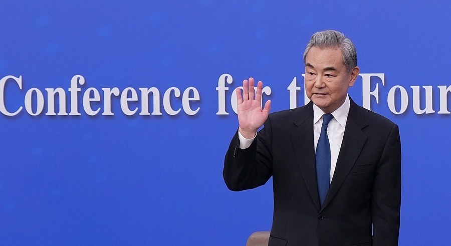 3月8日,十四届全国人大四次会议在北京梅地亚中心新闻发布厅举行记者会。中共中央政治局委员、外交部长王毅就“中国外交政策和对外关系”相关问题回答中外记者提问。这是记者会结束时,王毅向记者挥手致意。新华社记者 王曦 摄