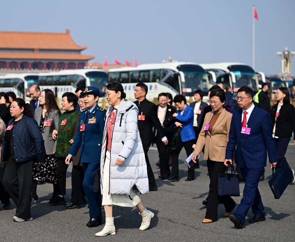 3月8日,全国政协十四届四次会议在北京人民大会堂举行第三次全体会议。这是全国政协委员走向会场。新华社记者 陈晔华 摄