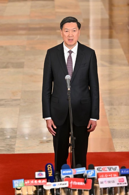 3月9日,第十四届全国人民代表大会第四次会议第二场“部长通道”集中采访活动在北京人民大会堂举行。这是国家体育总局局长高志丹接受媒体采访。新华社记者 李鑫 摄