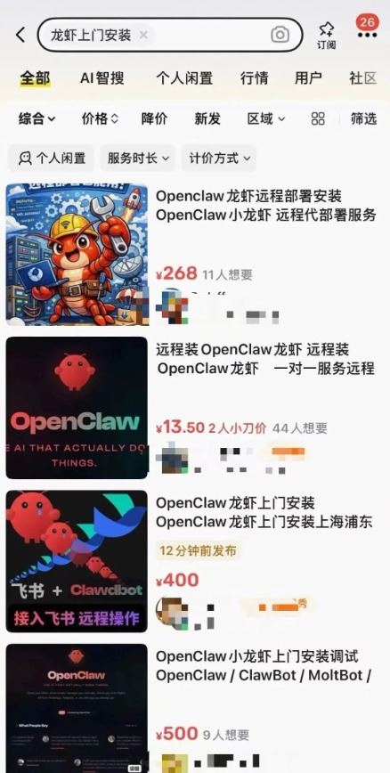 在一些平台搜索“龙虾/OpenClaw上门安装”,会发现这项服务价格从300元到800元不等,500元/次为最常见的价格。也可以“远程安装”,价格在50-100元左右。有网友称几天内靠这项服务赚取26万元。