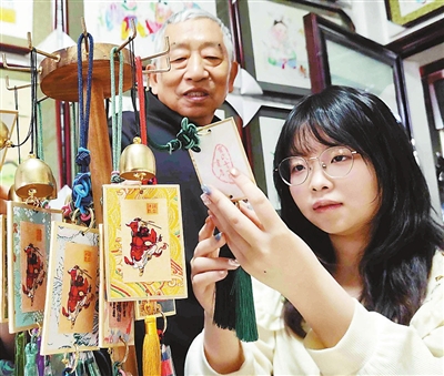 霍庆有孙女霍英琦(右一)设计的第一款年画元素文创挂饰。天津日报记者 曹彤 摄