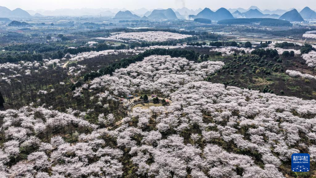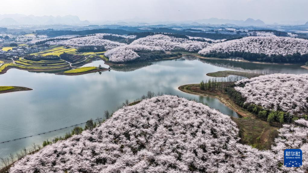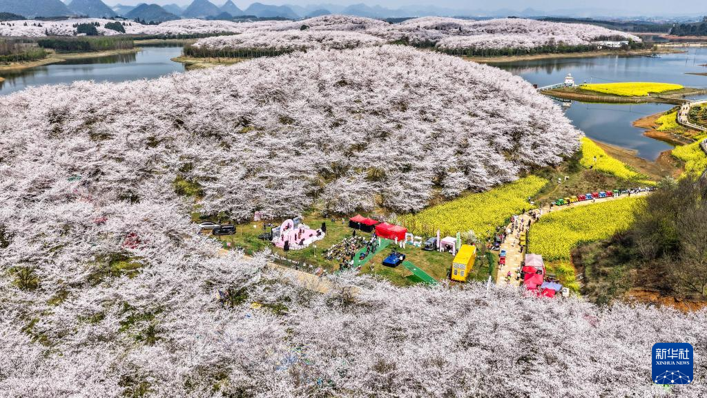 近日,随着气温回升,贵州省贵安新区樱花园内的2.4万亩樱花迎来盛花期。如云似霞的樱花和山川、湖泊、民居构成一幅幅美丽的春日画卷,吸引众多游客前来观光游玩。