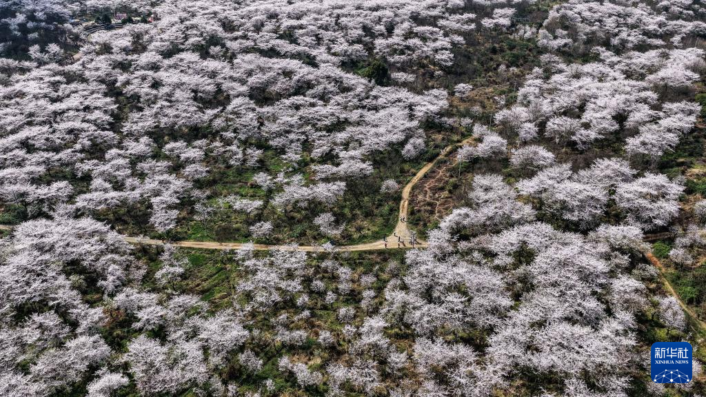 游客在贵州省贵安新区樱花园内赏花游玩(3月11日摄,无人机照片)。新华社记者 陶亮 摄