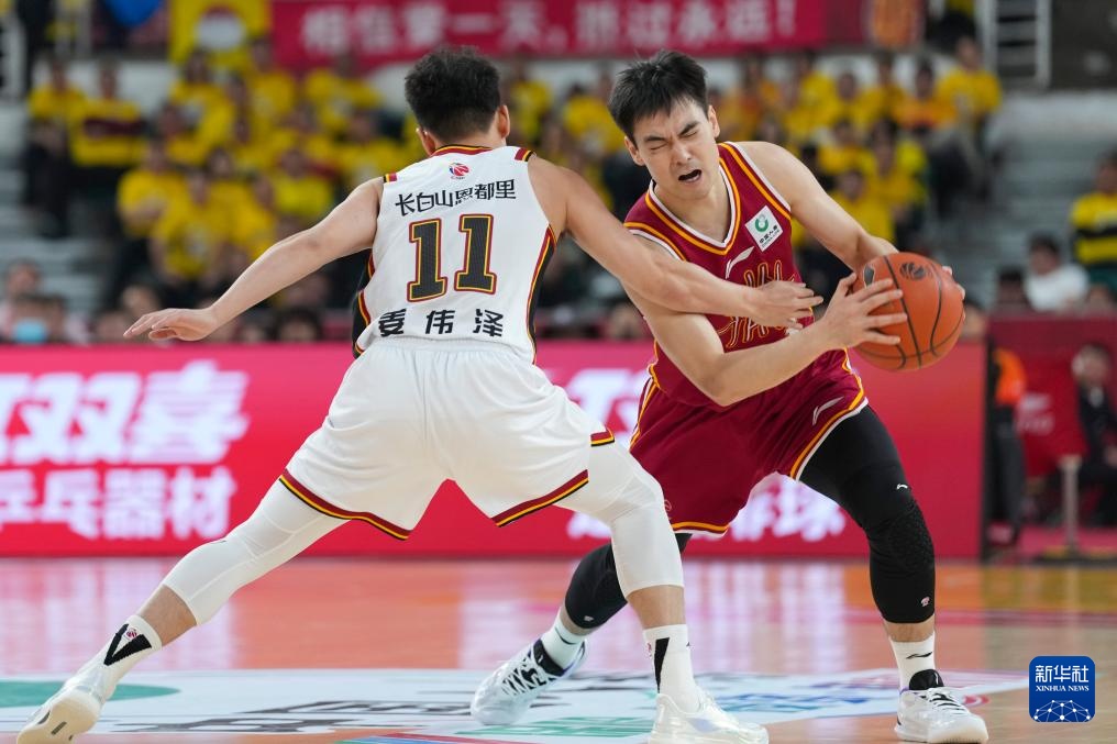 3月11日,吉林长白山恩都里队球员姜伟泽(左)和山西汾酒队球员于米提在比赛中争抢。新华社记者 杨晨光 摄