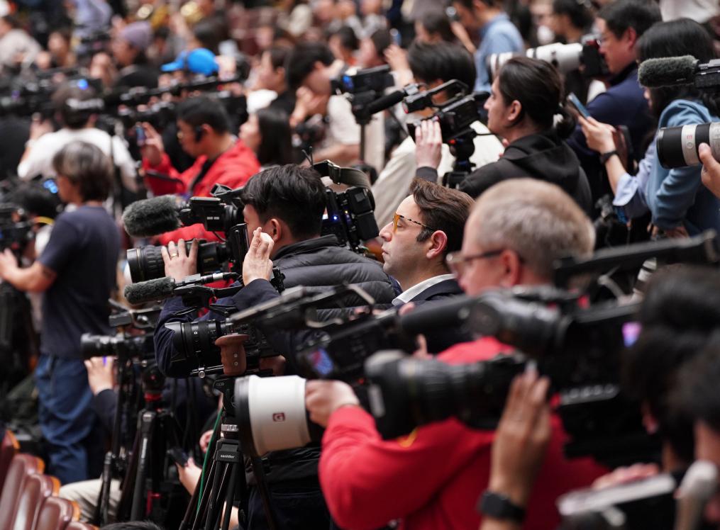 3月12日,十四届全国人大四次会议在北京人民大会堂举行闭幕会。这是记者在闭幕会上采访。新华社记者 傅天 摄