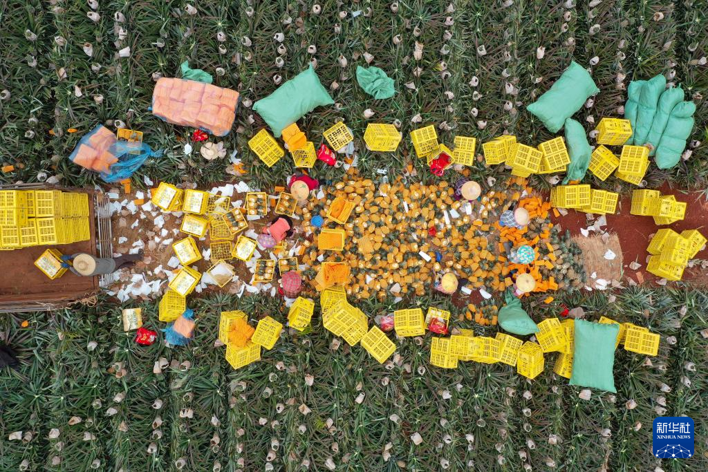 3月12日,农民在海口大坡镇将凤梨打包装箱(无人机照片)。新华社记者 郭程 摄