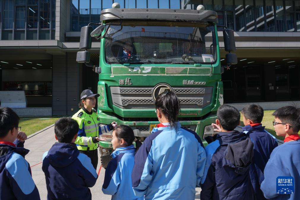 3月13日,杭州市公安局交通管理支队警官就大型车辆安全风险点指导青少年如何远离盲区、安全避让。新华社记者 黄宗治 摄