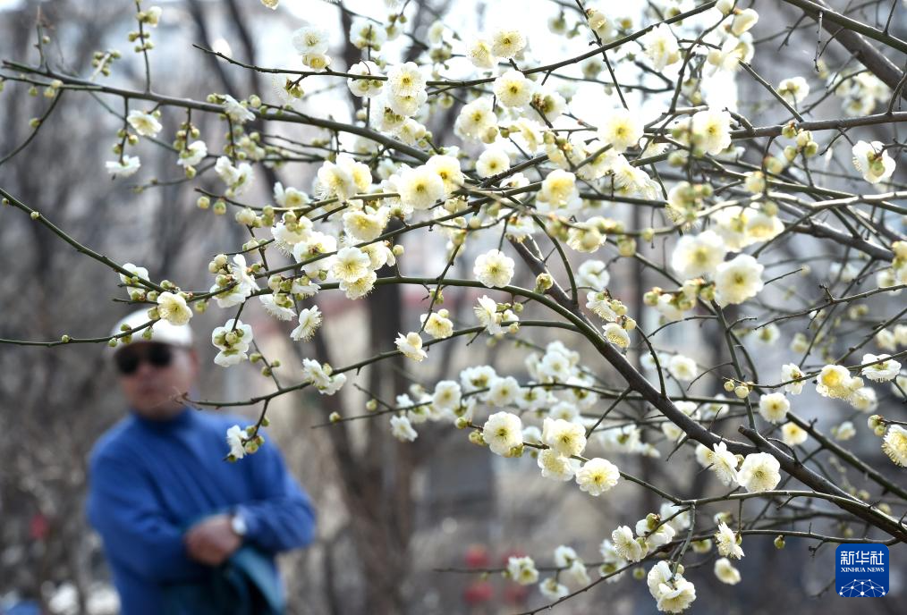 3月16日,一名游客在北京明长城遗址公园欣赏绽放的梅花。新华社记者 罗晓光 摄