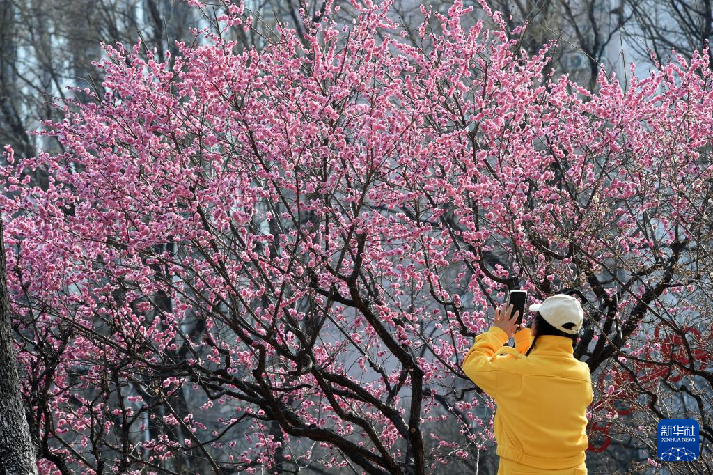 3月16日,一名游客在北京明长城遗址公园拍摄绽放的梅花。新华社记者 罗晓光 摄
