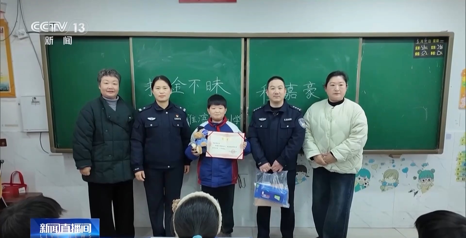 3月1日17点多,淮滨县第一小学五年级学生程嘉豪放学回家路上,捡到一个被遗落的背包,发现里面有6万元现金。虽然下着雨,程嘉豪在家长的陪同下,及时将背包及6万元现金交到了附近派出所,经民警核实后物归原主。为弘扬这种拾金不昧的精神,3月16日,当地民警专程来到淮滨一小,为程嘉豪同学颁发了荣誉证书。