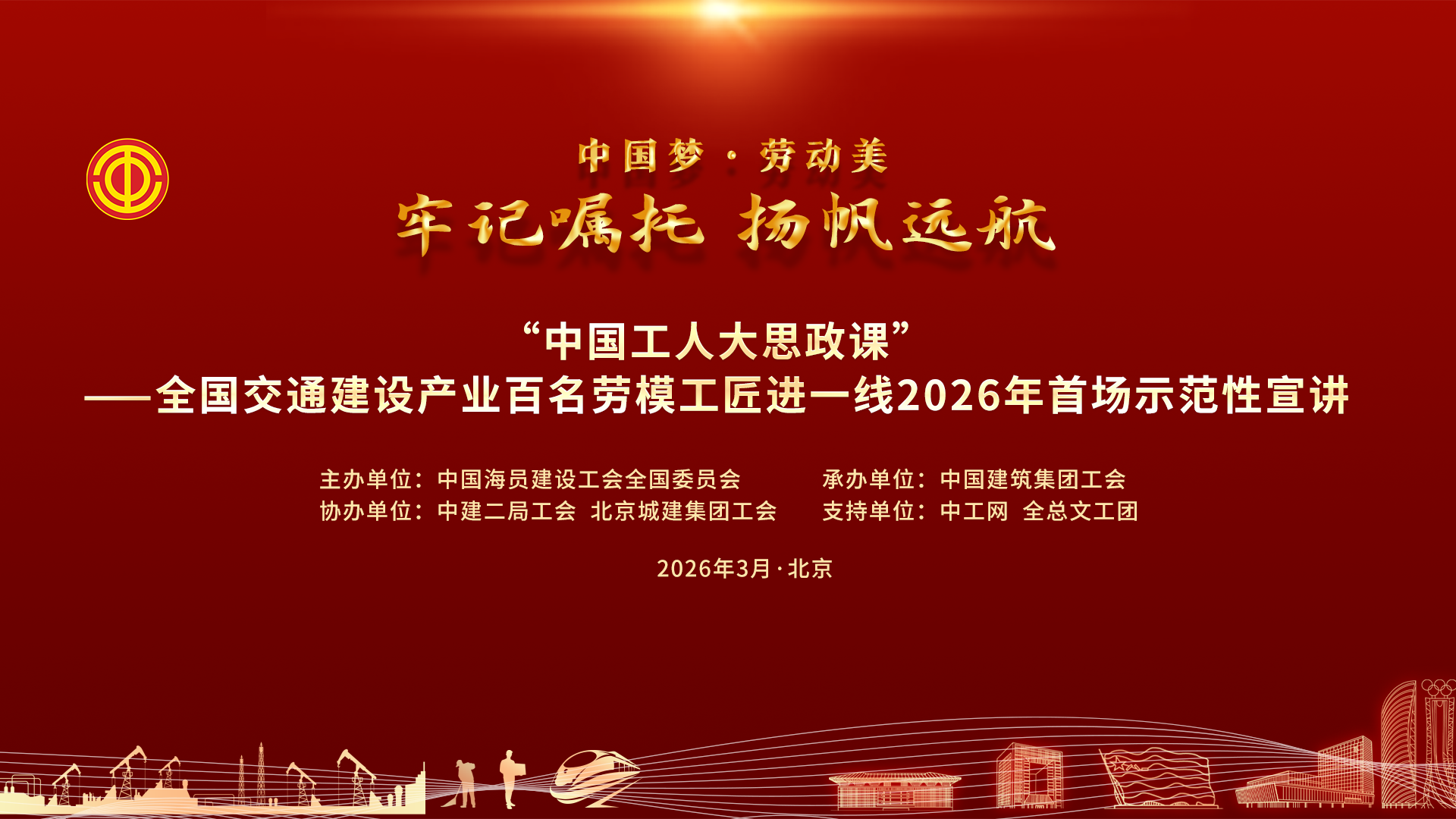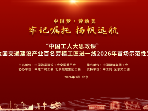 直播回顾|“中国工人大思政课”全国交通建设产业百名劳模工匠进一线2026年首场示范性宣讲 3月19日,“中国工人大思政课”全国交通建设产业百名劳模工匠进一线2026年首场示范性宣讲在北京举行。本次活动以“牢记嘱托 扬帆远航”为主题,邀请全国技术能手、中交隧道工程局有限公司研究院副院长徐文礼,全国劳动模范、中建电力建设有限公司程克辉,全国劳动模范、曹操出行司机张桂容,全国劳动模范、“蓝领专家”孔祥瑞,全国劳动模范、大国工匠竺士杰等5位交通建设系统劳模工匠代表,生动讲述他们用坚守书写担当、用匠心铸就品质、用创新驱动发展、用传承点亮未来的故事。3月19日15时,中工网首页、微博、视频号同步播出。与劳模工匠“云”端相见,共上一堂有温度、有力量的思政课!