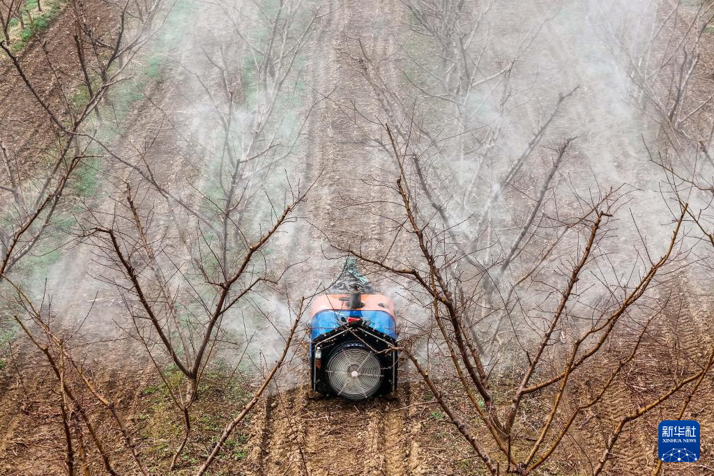 3月19日,山西省运城市平陆县张村镇的农民为果树喷洒农药(无人机照片)。新华社记者 曹阳 摄