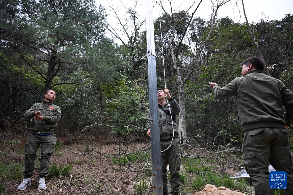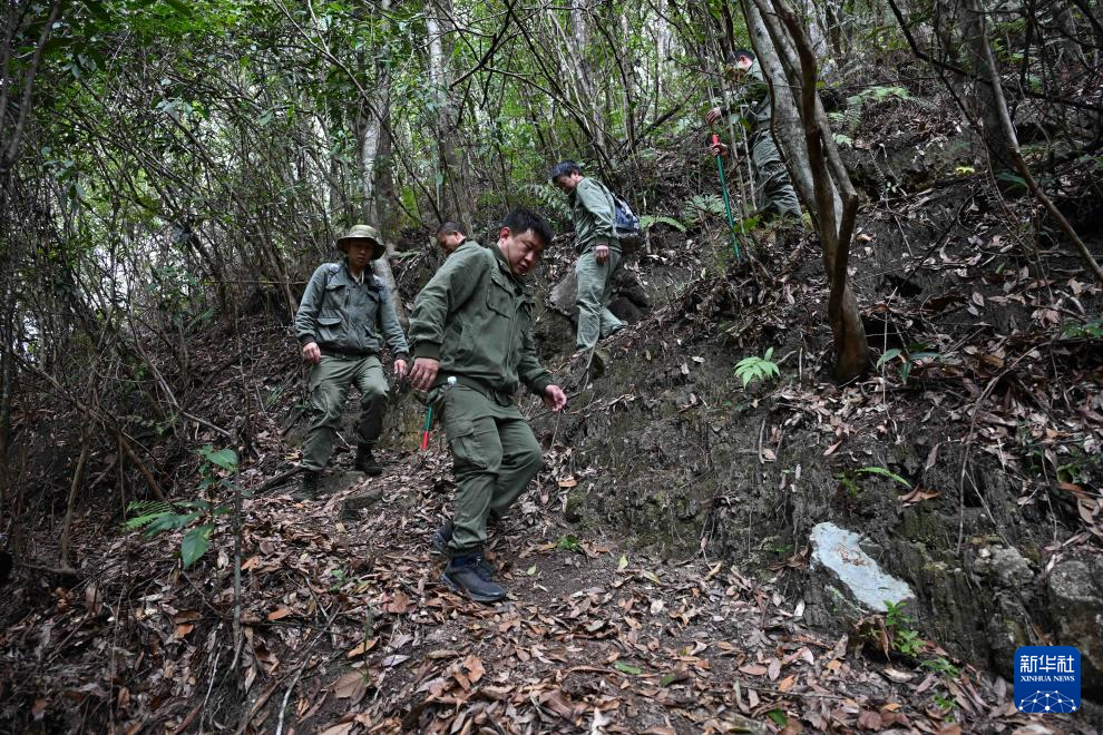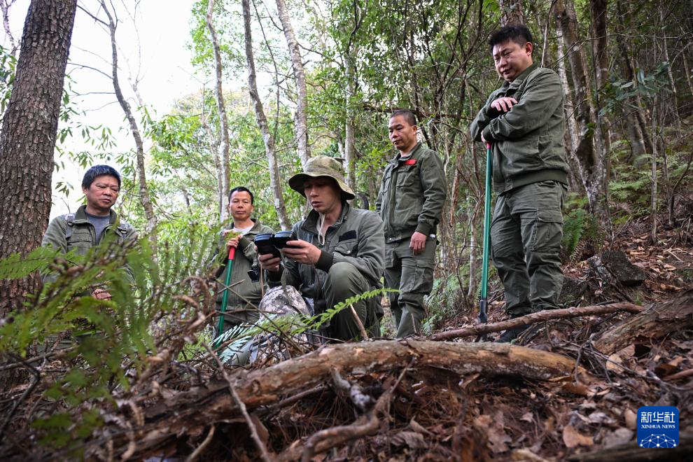 3月17日,广东省乳阳林场八宝山管护站护林员在鸡公坑便道巡山途中,周智鹏(中)在准备红外相机。新华社记者 邓华 摄