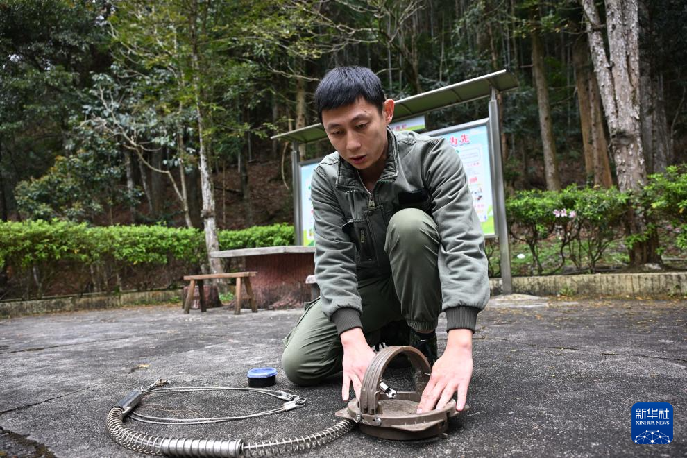 3月17日,广东省乳阳林场八宝山管护站负责人周智鹏介绍在巡山途中发现的捕兽夹。新华社记者 邓华 摄